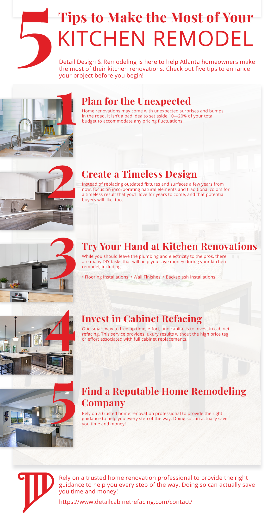Detail Design & Remodeling is here to help Georgia homeowners get the most out of their kitchen remodels, delivering high-quality craftsmanship backed by decades of experience and customer service. While we specialize in cabinet refacing for Atlanta properties, our home remodeling contractors have the skills to create amazing changes from top to bottom. Our pros also strive to help our customers in any way we can, including DIY tips and guidance.